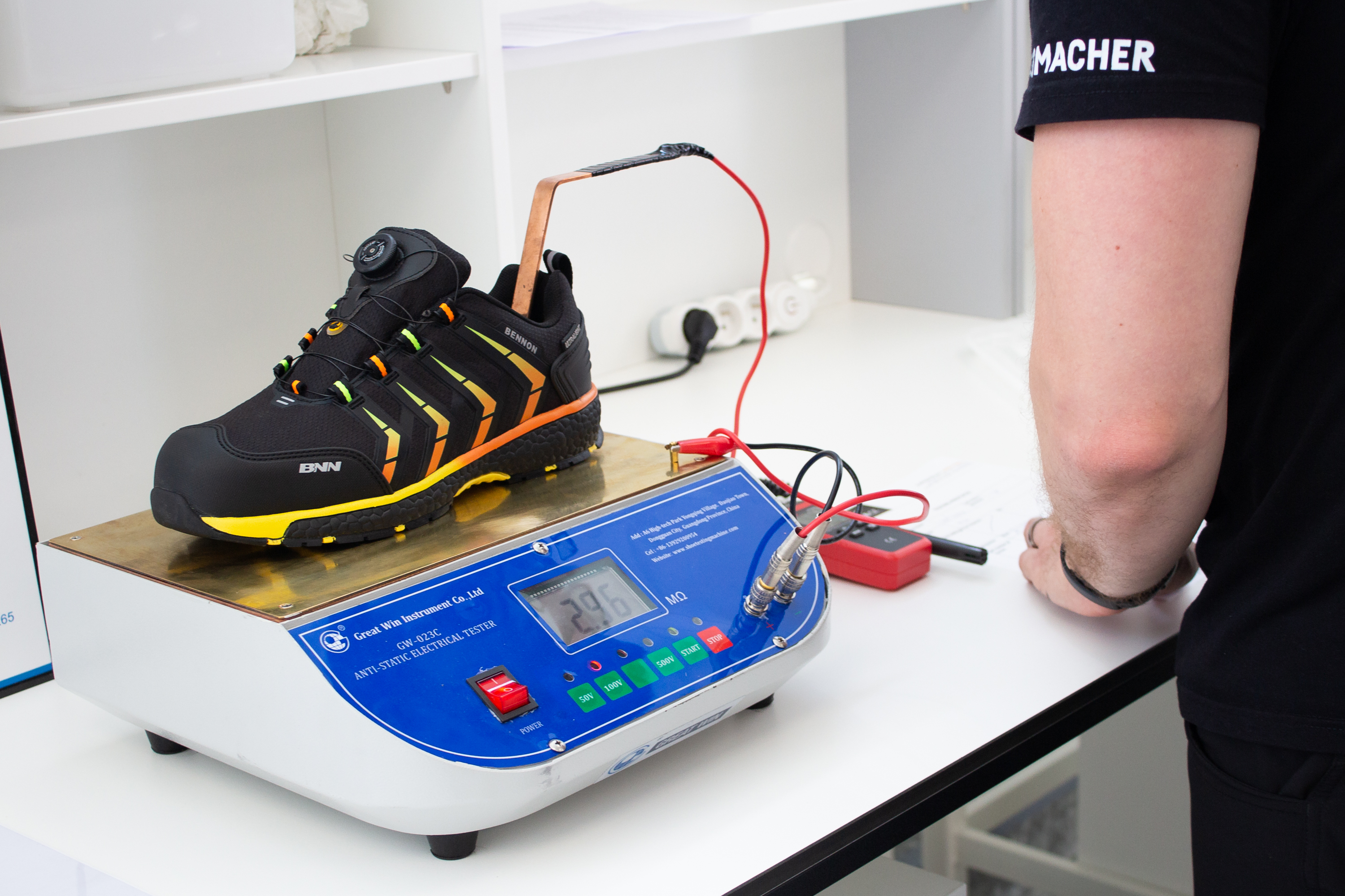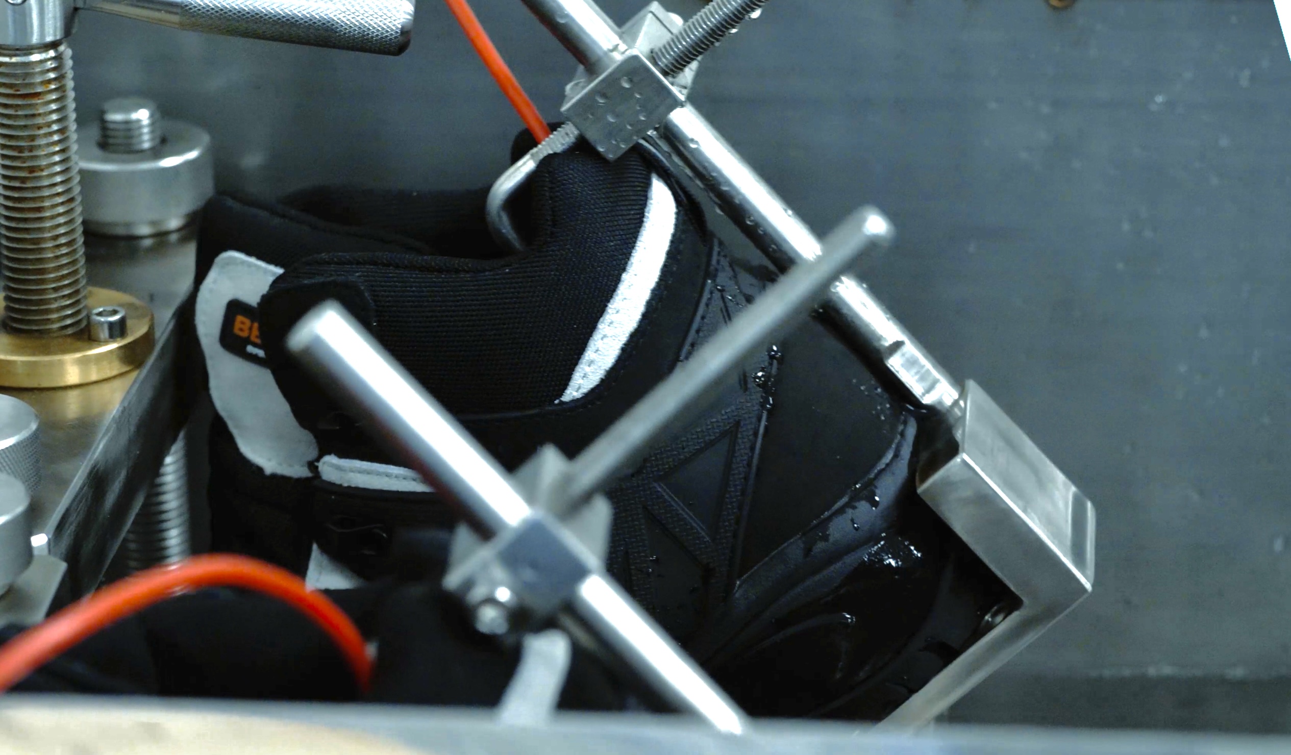 Po zamocowaniu obuwia w urządzeniu jest ono zginane pod kątem 45°, co symuluje chodzenie człowieka. W urządzeniu znajduje się woda na wysokości około 1 cm powyżej górnej krawędzi podeszwy, a elektrody umieszczone wewnątrz obuwia wykrywają ewentualne przecieki do wnętrza. Urządzenie umożliwia wykrywanie niedokładności technologicznych w obuwiu z membraną i pomaga nam poprawiać jakość konstrukcji obuwia.